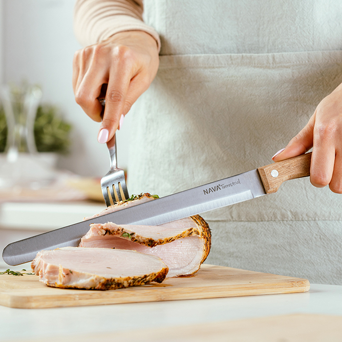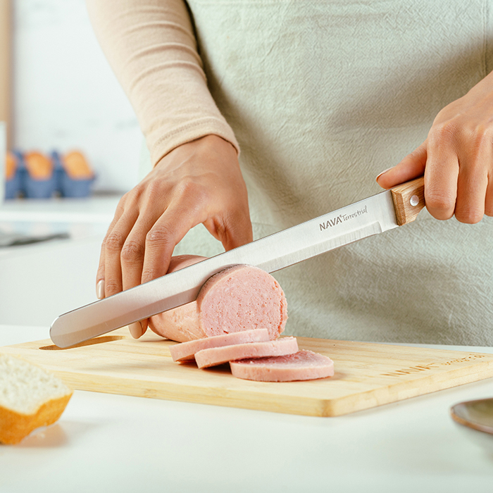 Το μαχαίρι αλλαντικών Terrestrial της NAVA διαθέτει λεία, μακριά και στενή λεπίδα που εγγυάται την κοπή σε λεπτές φέτες, με άνεση και ακρίβεια. Ιδανικό για αλλαντικά, όπως ζαμπόν, σαλάμι, προσούτο, μπέικον, ψητά, αλλά και ψάρια όπως ο σολομός.