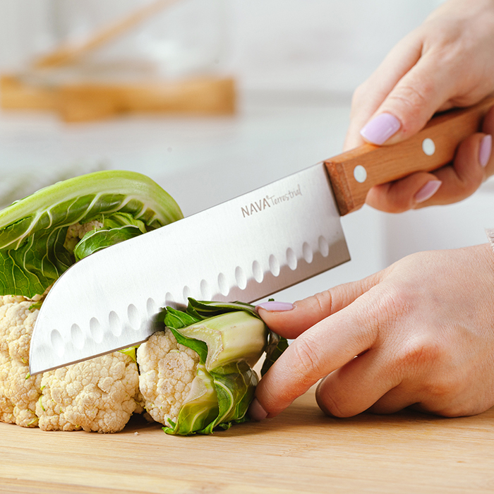 Το μαχαίρι Santoku Terrestrial της NAVA διαθέτει πλατιά, αιχμηρή λεπίδα Ιαπωνικού τύπου, με αυλακώσεις στην επιφάνειά της, οι οποίες δημιουργούν θύλακες αέρα που διατηρούν τη λάμα καθαρή, αποτρέποντας υπολείμματα από λεπτά, μαλακά τρόφιμα να κολλήσουν πάνω της. Εκτελεί με ταχύτητα και ακρίβεια μία ευρεία γκάμα εργασιών κατά την προετοιμασία των γευμάτων, όπως να κόψετε ή να τεμαχίσετε σε κύβους κρέας, λαχανικά ή φρούτα και να ψιλοκόψετε μυρωδικά.
