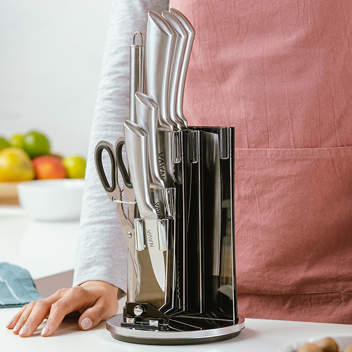 Κατασκευασμένα από ανοξείδωτο ατσάλι 18/8, είναι εξαιρετικά ανθεκτικά και παραμένουν αιχμηρά στον χρόνο. Διαθέτουν εργονομικές λαβές για άνετο χειρισμό και προσφέρουν ακρίβεια και ταχύτητα στο κόψιμο. Συνοδεύονται από περιστρεφόμενη ακρυλική βάση για την εύκολη και ασφαλή αποθήκευση των μαχαιριών.