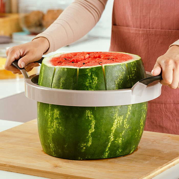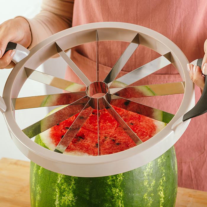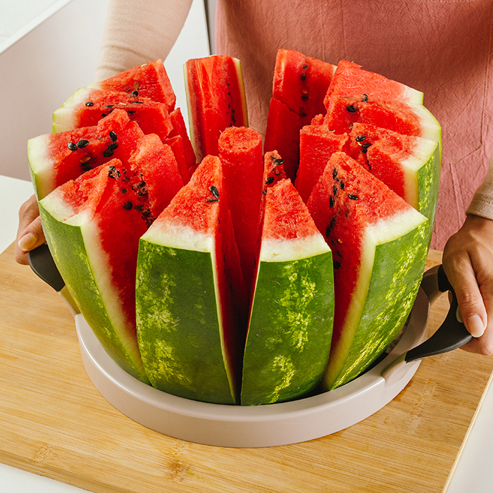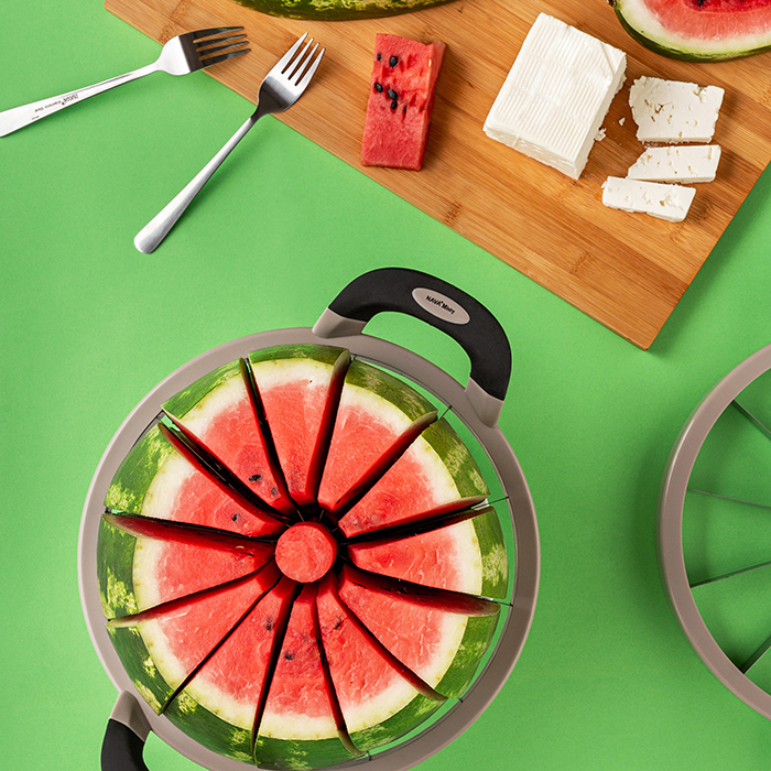 Όταν πλησιάζει το καλοκαίρι, το ιδανικό φρούτο που μας θυμίζει ηλιόλουστες ημέρες στην παραλία, απογευματινές ώρες χαλάρωσης στο μπαλκόνι, υπέροχα σπιτικά επιδόρπια, δεν είναι άλλο από το δροσιστικό και ζουμερό καρπούζι. Δημιουργήστε 12 ομοιόμορφες φέτες καρπουζιού εύκολα και γρήγορα, με μία μόνο κίνηση με τον καρπουζοκόφτη Misty της NAVA. Απλά κόβετε τις άκρες του φρούτου, τοποθετείτε το εργαλείο στην κορυφή του και πιέζετε από τις λαβές κάθετα. Εάν επιθυμείτε μικρότερα κομμάτια, μπορείτε να κόψετε το καρπούζι στη μέση.
