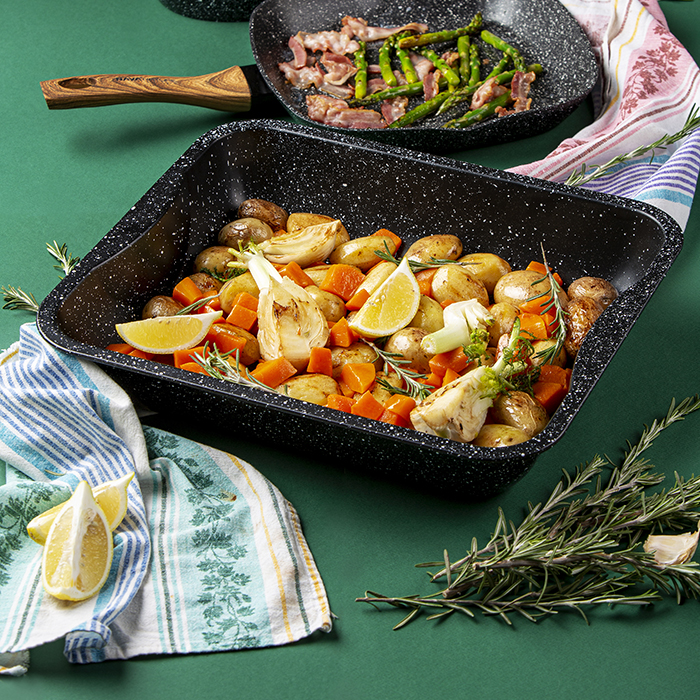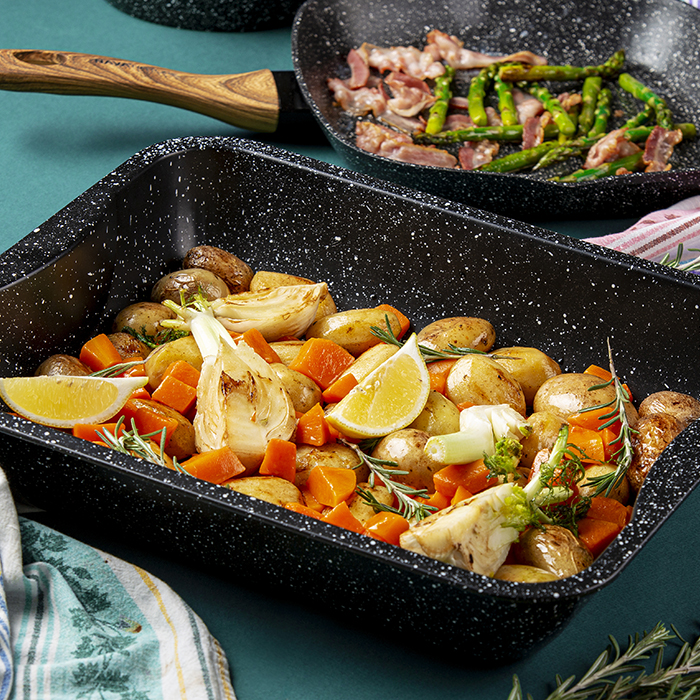 Το ταψί είναι κατασκευασμένο από ατσάλι που εξασφαλίζει την ομοιόμορφη κατανομή της θερμότητας στο σκεύος για καλύτερο μαγειρικό αποτέλεσμα. Η αντικολλητική επίστρωση stone επιτρέπει την εύκολη αφαίρεση του φαγητού καθώς και εύκολο καθαρισμό του σκεύους μετά τη χρήση.