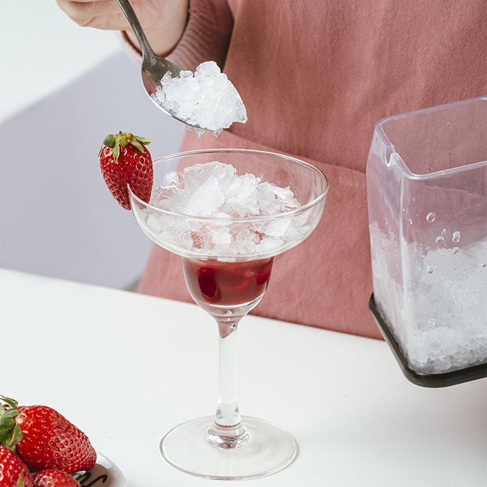 Διαθέτει αποσπώμενο καπάκι, δοχείο συλλογής πάγου και χειροκίνητο μηχανισμό για τη θραύση του πάγου.