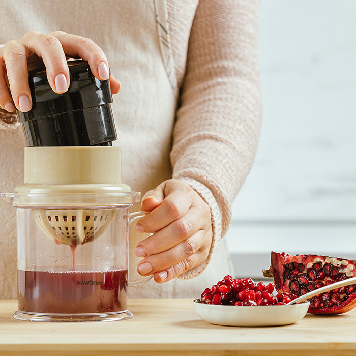 Η μία λειτουργία του πολυχρηστικού εργαλείου είναι ως πρέσα, απλά τοποθετείτε τα καθαρισμένα φρούτα στο σουρωτήρι και πιέζετε στριφογυρίζοντας το αποσπώμενο καπάκι-πρέσα, ώστε να ξεχωρίσετε το χυμό από τα κουκούτσια και τον πολτό. Αντιστρέφοντας το σουρωτήρι που εξυπηρετεί ως συλλέκτης κουκουτσιών, έχετε στη στιγμή έναν αποχυμωτή, για να στύψετε τα εσπεριδοειδή φρούτα σας.